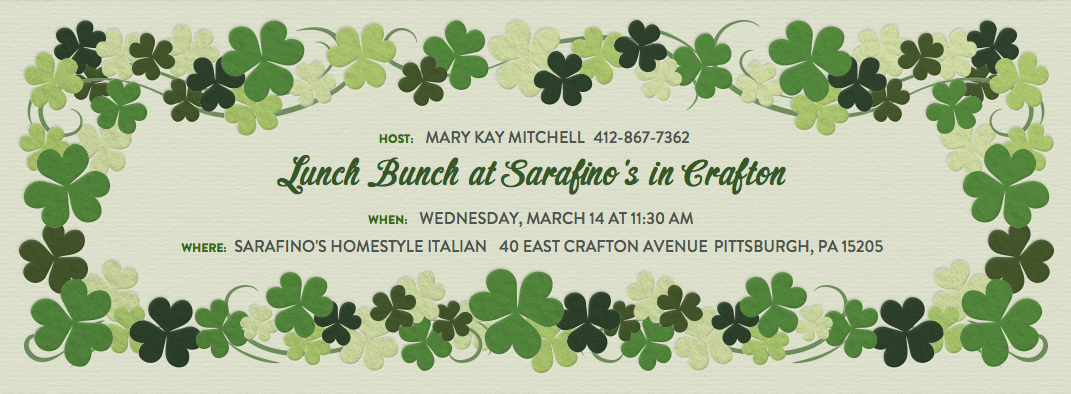 Come out during the Green days of March and join your sisters for lunch at Sarafino’s, this Italian-American former pharmacy serves great bread and first rate beans and greens. The Delta Gammas like the round tables at this quaint little spot in Crafton. RSVP to evite directly or to Mary Kay Mitchell at mkaymitchell@verizon.net or 412-867-7362.