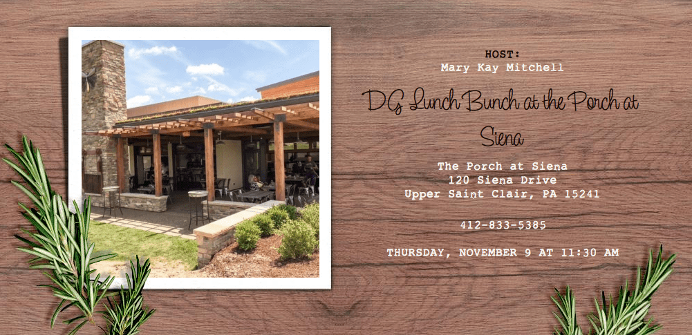 Come have lunch on Thursday November 9th at 11:30am with your DG Sisters at this new restaurant in USC: The Porch at Siena, this is the sister restaurant to THE PORCH AT SCHENLEY in Oakland, the menu features Mediterrean inspired dishes. RSVP directly to evite or to Mary Kay Mitchell at mkaymitchell@verizon.net or 412-867-7362.