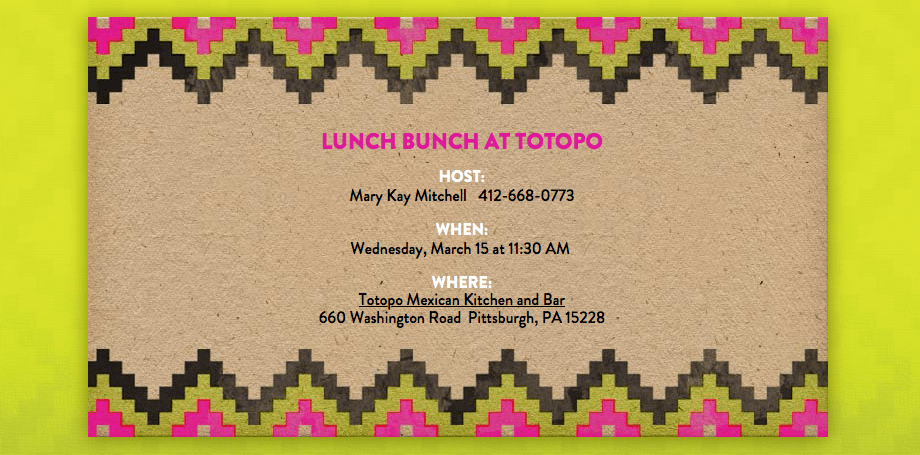 WHEN: Wednesday, March 15 at 11:30 AM WHERE: Totopo Mexican Kitchen and Bar: 660 Washington Road Pittsburgh, PA 15228 Come out and join your DG Sisters for lunch at Totopo, the newest addition to the Washington Road food scene. Their menu features authentic Mexican menu and they make guacamole at your table! RSVP either directly to evite orContinue reading “Lunch Bunch at Totopo”