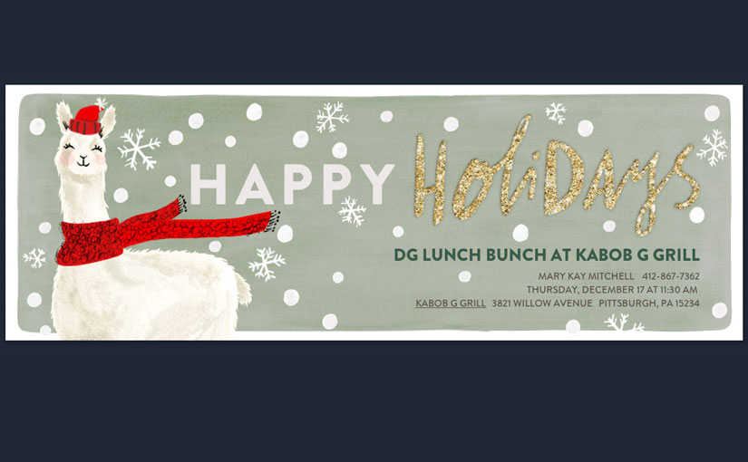 THURSDAY, DECEMBER 17 AT 11:30 AM KABOB G GRILL 3821 WILLOW AVENUE PITTSBURGH, PA 15234 Come out for lunch to celebrate the Holidays with your DG Sisters at Kabob G Grill…. Our Christmas gift to ourselves-This cozy restaurant surprised us last year as we shared classic Mediterranean and Middle Eastern delights. We ate a gallon of tabbouleh. RSVPContinue reading “DG LUNCH BUNCH AT KABOB G GRILL”