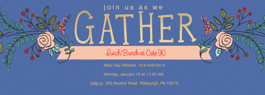 Come join us at Cafe IO to warm up with comfort food, perfect for our January gathering as we bring in the New Year! Monday, January 15 at 11:30 AM Cafe io 300 Beverly Road Pittsburgh, PA 15216 RSVP directly to evite or to Mary Kay at mkaymitchell@verizon.net or 412-867-7362.